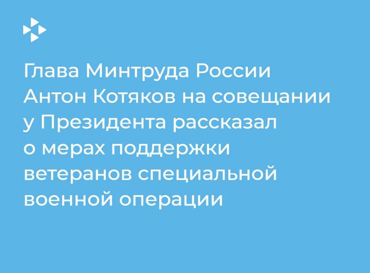 Глава Минтруда России Антон Котяков на совещании у Президента рассказал о ключевых решениях по поддержке ветеранов специальной военной операции.