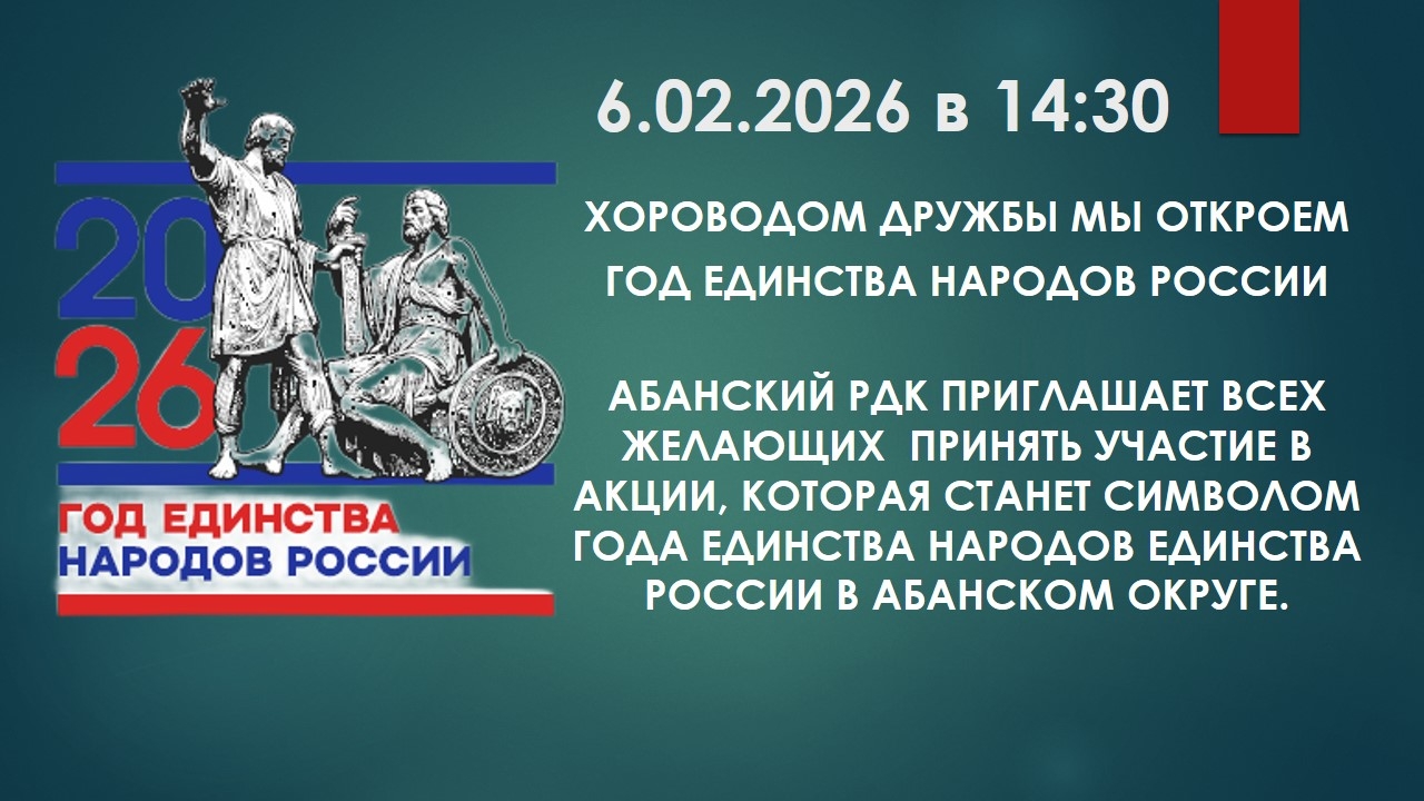 Абанский РДК приглашает всех желающих принять участие в хороводе дружбы. Хоровод дружбы- акция, которая станет символом открытия Года единства народов единства России в Абанском округе. Участие в акции примут педагоги и воспитанники абанских школ, волонтёры культуры, коллективы учреждений социальной сферы. Присоединяйся и ты!!!