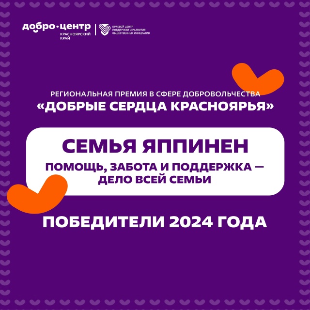 🏅Семья удостоена звания лауреата региональной премии в сфере добровольчества «Добрые сердца Красноярья» 2024г.