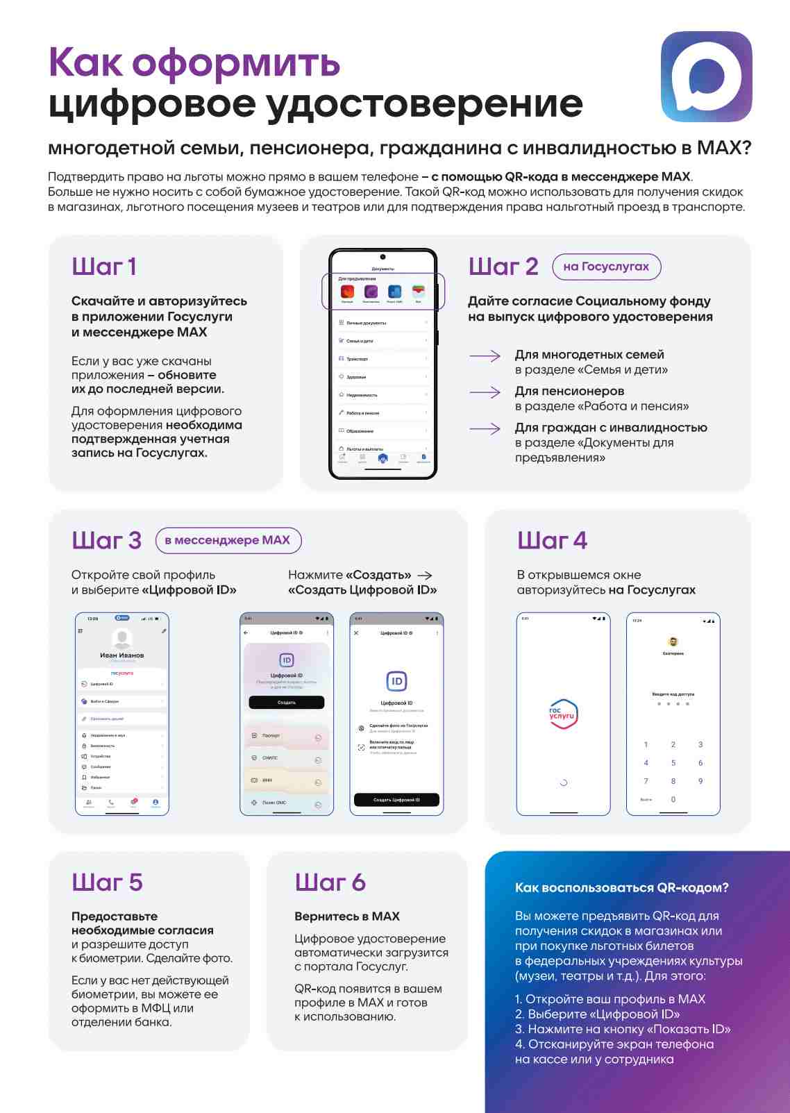 Цифровой ID в МАХ — это аналог бумажных документов, который позволяет подтверждать возраст, статус студента, многодетного родителя и многое другое. Подтверждение личности осуществляется посредством постоянно обновляющегося динамического QR-кода в профиле мессенджера. Создавать и использовать Цифровой ID могут граждане России старше 18 лет.