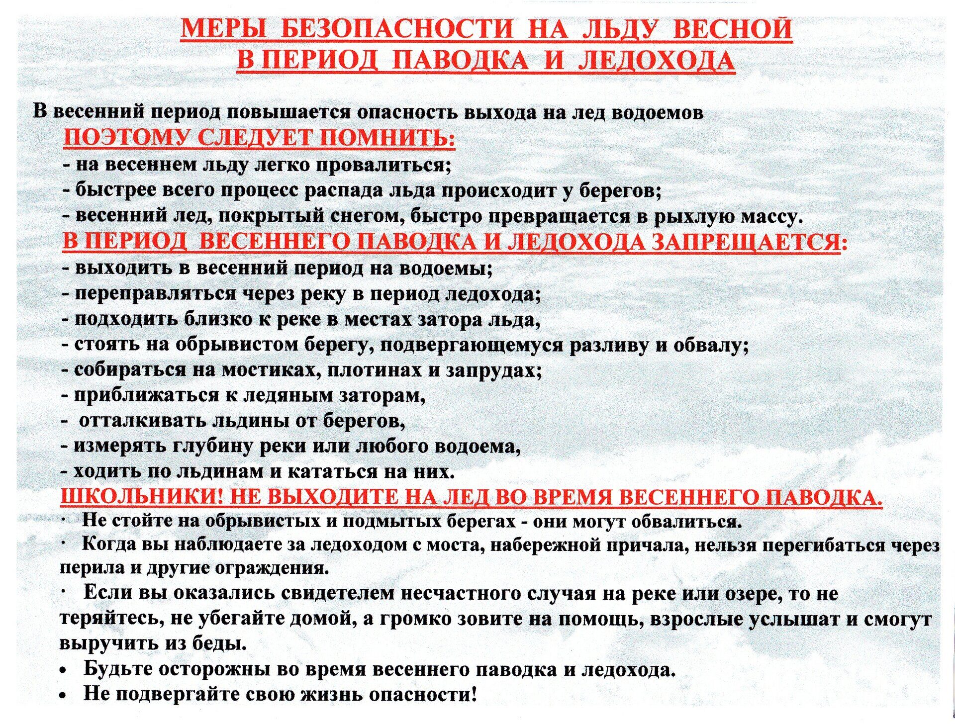 • Внимательно следить за метеосводками и уровнем воды в водоемах.