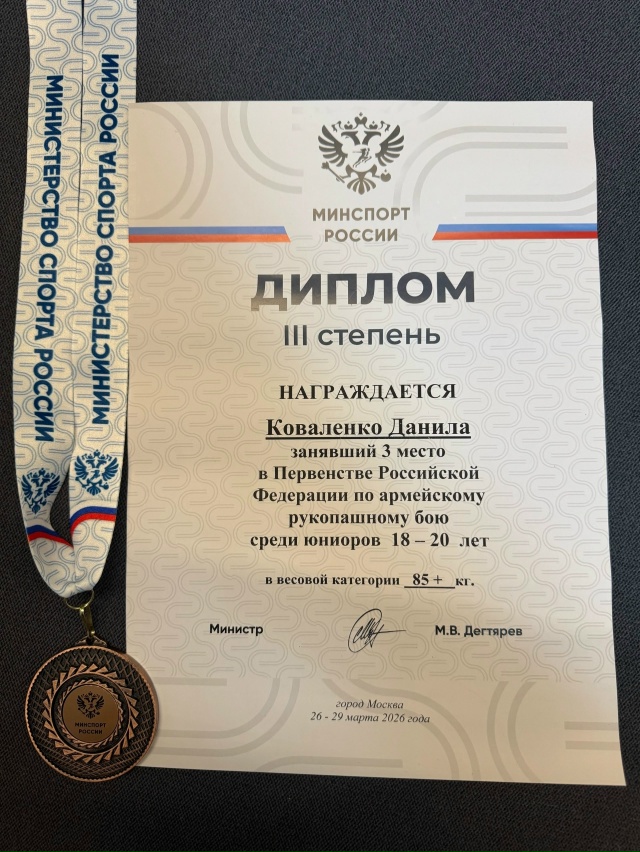 26-29 марта 2026 в г.Москве состоялось ПЕРВЕНСТВО РОССИИ ПО АРМЕЙСКОМУ РУКОПАШНОМУ БОЮ. За всю историю вида спорта АРБ это самое массовое первенство России. Более 900 участников из 48 регионов РФ. Наш выпускник Коваленко Данила стал БРОНЗОВЫМ ПРИЗЕРОМ главного турнира в нашей стране среди юниоров 18-20 лет в самой тяжелой весовой категории свыше 85кг. Данил включен в СБОРНУЮ КОМАНДУ РОССИИ для участия в первенстве мира, которое состоится этой осенью. Поздравляю семью Данила, клуб Армеец, в котором Данил тренируется под руководством Данилова Р.Е. и всю нашу большую команду клуба "Абан".