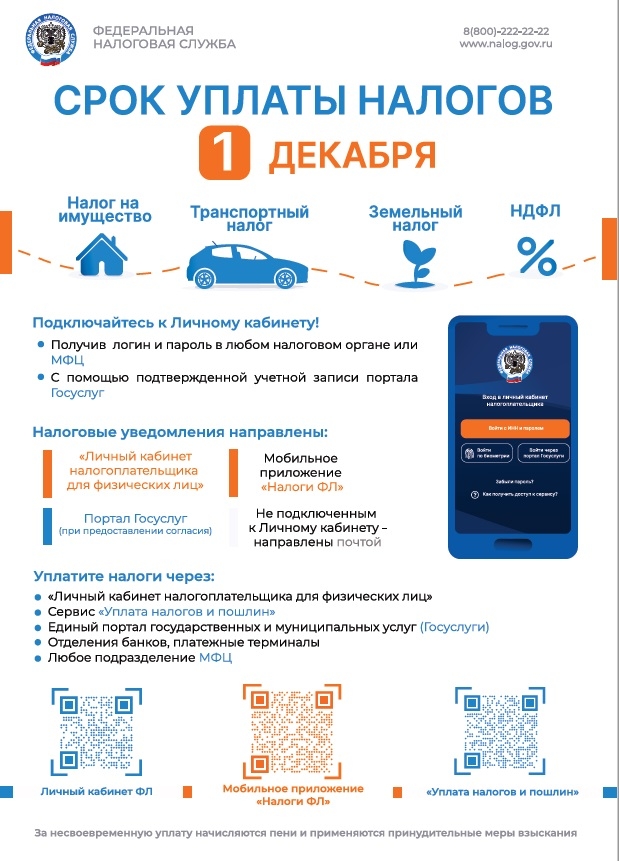 Уплатить имущественные налоги за 2024 год необходимо не позднее 1 декабря 2025 года. К имущественным налогам относятся транспортный, земельный, а также налог на имущество физических лиц.
