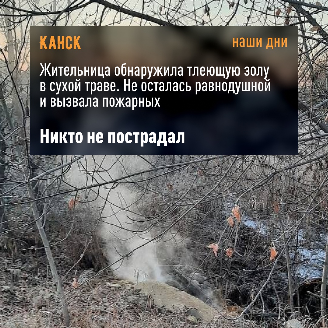 На днях жительница Канска вовремя вызвала пожарных, заметив тление золы в сухой траве рядом с частным сектором. Благодаря оперативным действиям огонь удалось остановить.