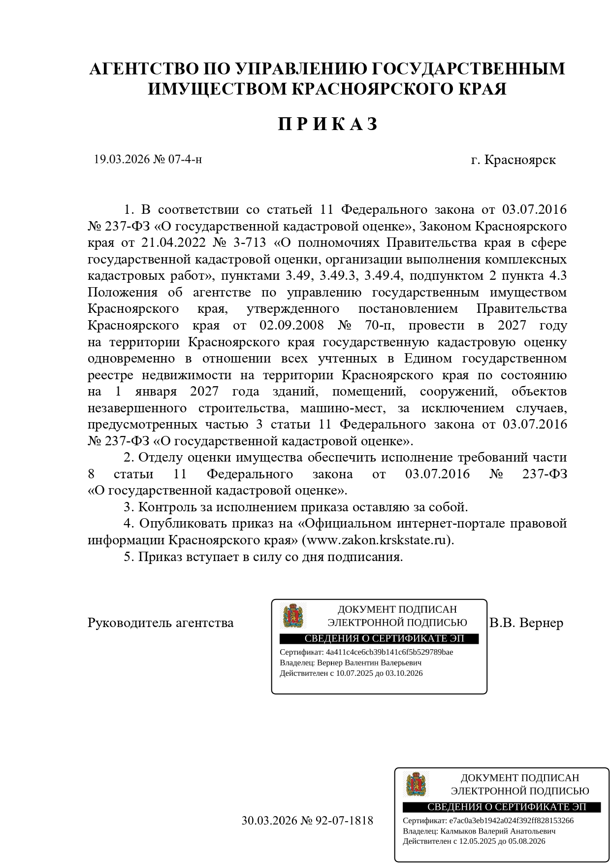Приказ агентства по управлению государственным имуществом Красноярского края от 19.03.2026 № 07-4-н «О проведении в 2027 году государственной кадастровой оценки зданий, помещений, сооружений, объектов незавершенного строительства, машино-мест на территории Красноярского края» (далее – агентство, приказ № 07-4-н) опубликован 20.03.2026 на «Официальном интернет-портале правовой информации Красноярского края» (www.zakon.krskstate.ru), и на официальном сайте агентства в информационно-телекоммуникационной сети «Интернет» (http://www.proks.krskstate.ru) в разделе «Государственная кадастровая оценка».
