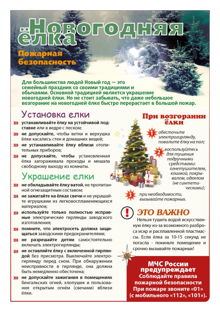 Приближается самый яркий, веселый и радостный праздник - Новый год! Украшение жилья к празднику – давняя и красивая традиция, в которой принимают участие все члены семьи. Сколько радости дарит нам наряженная, сверкающая разноцветными шарами и переливающимися гирляндами зимняя красавица царица-елка. Но в то же время украшенная елочка является и источником большой опасности. Чтобы новогодние праздники прошли хорошо, без несчастных случаев необходимо соблюдать определенные правила безопасности.