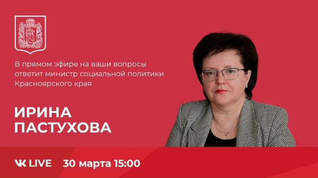 30 марта 2026 в группе министерства социальной политики Красноярского края пройдет прямой эфир с министром Ириной Леонидовной Пастуховой. Прямая линия будет посвящена льготам на оплату жилищно-коммунальных услуг.