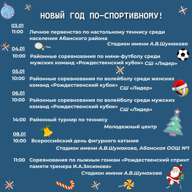 С приближением самых долгожданных и волшебных праздников: Нового года и Рождества – учреждения культуры, спорта и молодежной политики Абанского района по традиции подготовили для вас программу предновогодних и праздничных мероприятий! Представляем вашему вниманию традиционный календарь событий, который призван наполнить эти особенные дни яркими впечатлениями, радостью и незабываемыми моментами.