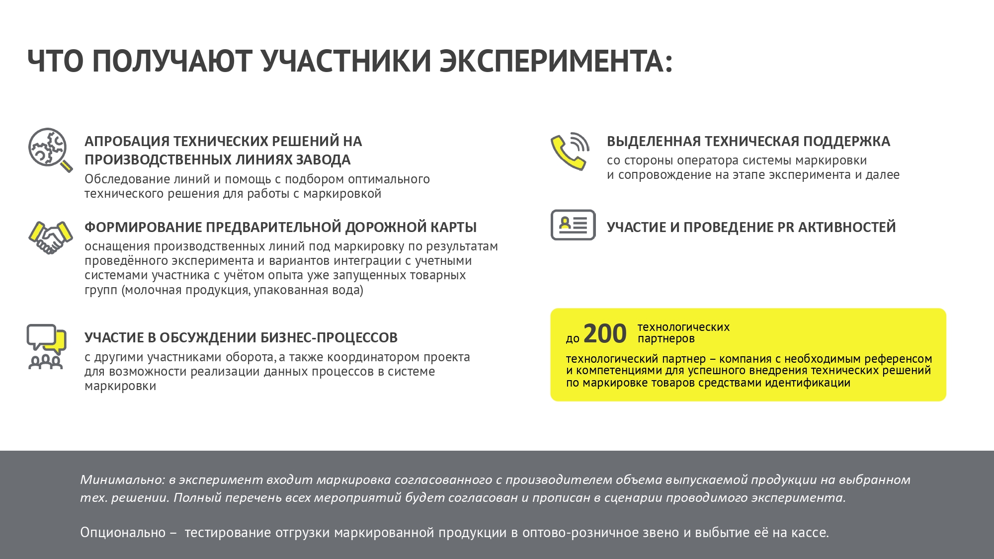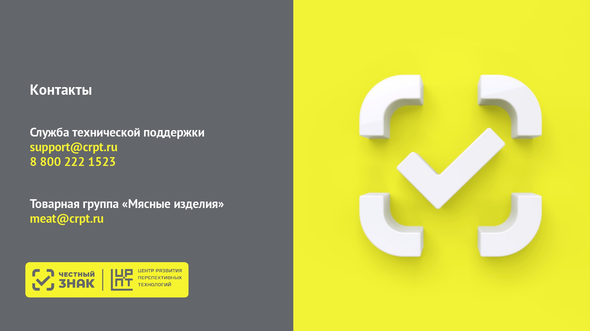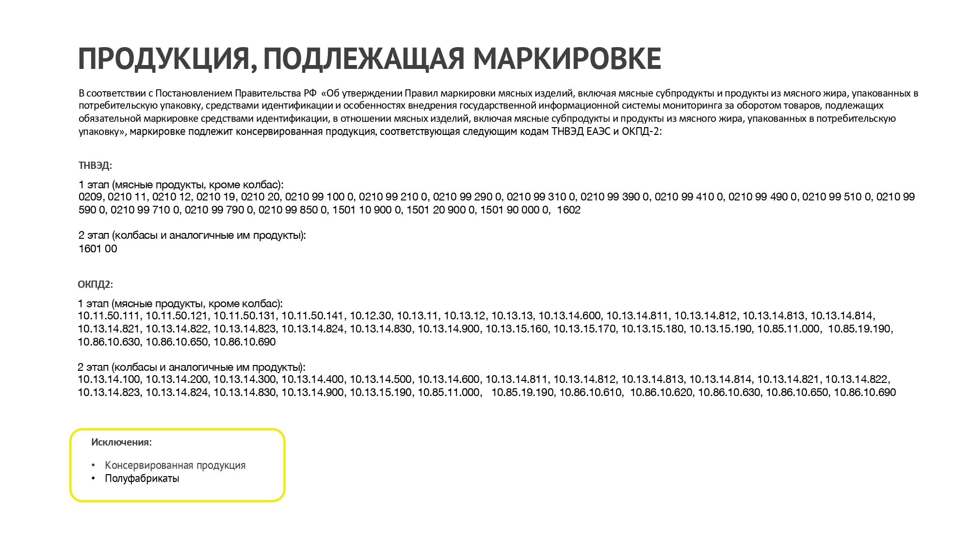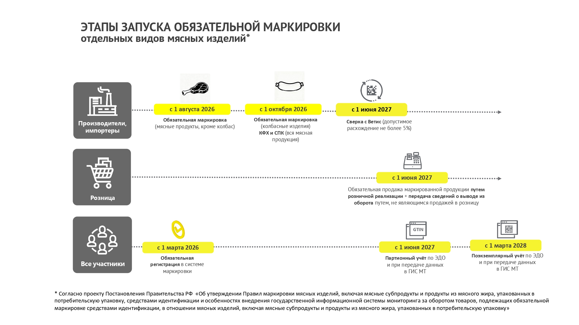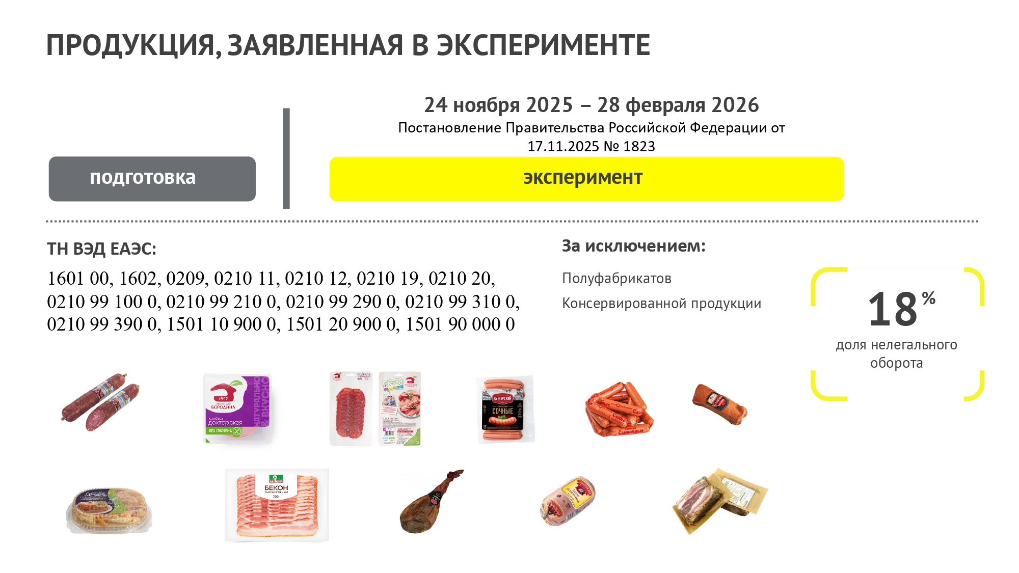 Согласно постановлению Правительства РФ от 17.11.2025 №1823 проводятся эксперименты по маркировке средствами идентификации мясных изделий, включая изделия колбасные и аналогичную пищевую продукцию из мяса, субпродуктов или крови животных, из мяса и субпродуктов птицы, упакованных в потребительскую упаковку, а также полуфабрикатов и замороженной пищевой продукции, упакованных в потребительскую упаковку: