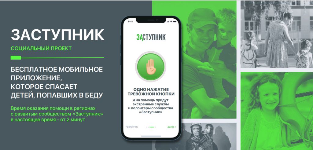 «Заступник» — бесплатное мобильное приложение для оперативной помощи детям. Оно позволяет детям в возрасте от 4 до 18 лет в экстренной ситуации нажатием одной кнопки подать сигнал бедствия и получить незамедлительную помощь волонтёров.