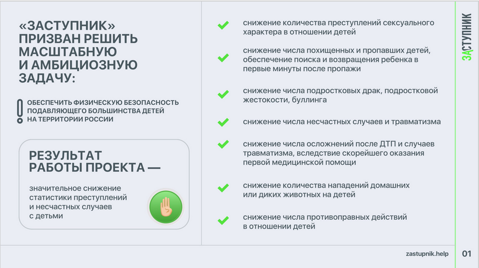 Задача проекта — повысить защищённость детей по всей стране и сделать города, районы и улицы более безопасными благодаря совместным действиям родителей, волонтёров, экстренных служб.