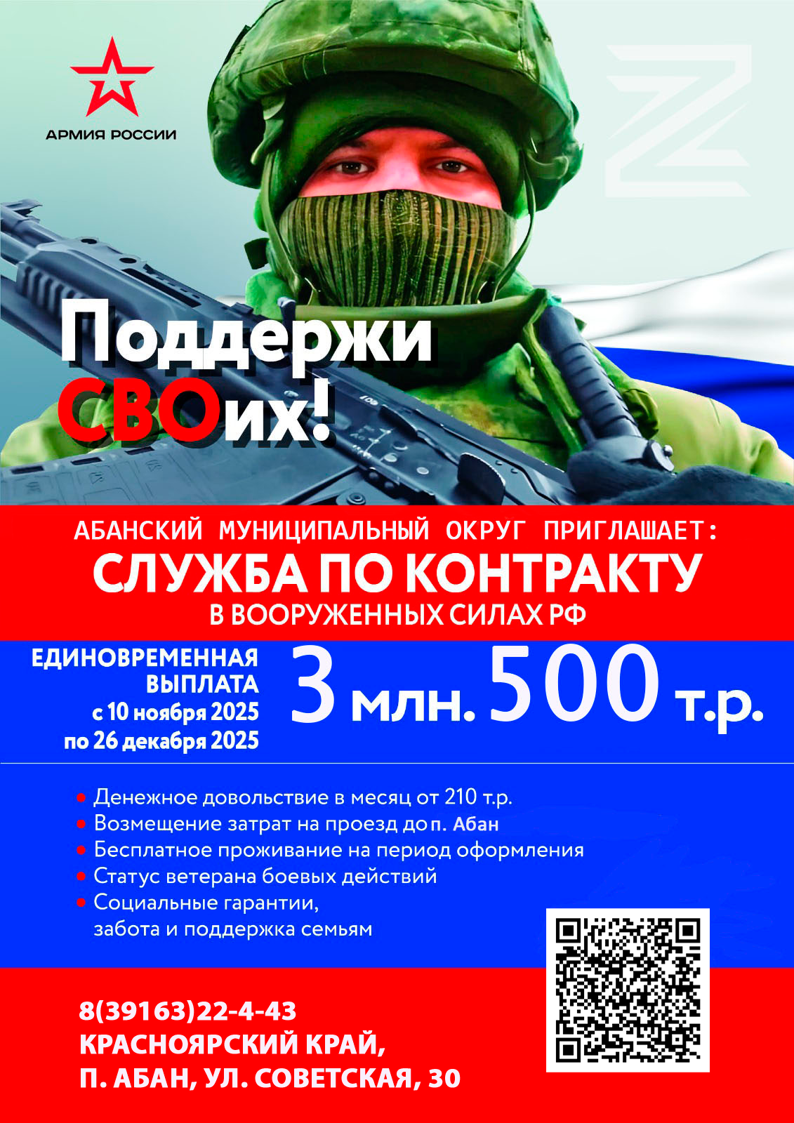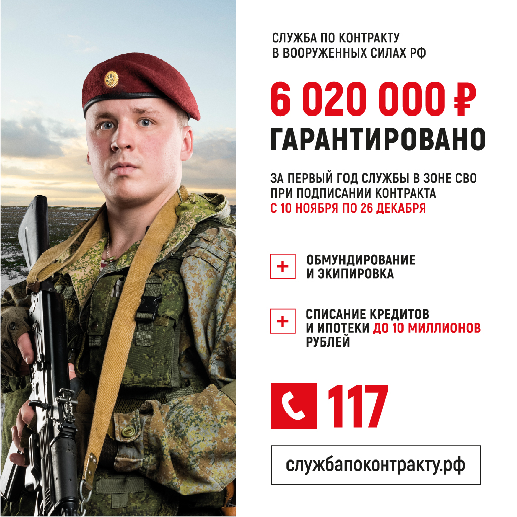 В Красноярском крае с 15 августа до 1,7 млн рублей увеличен размер выплат военнослужащим, заключившим контракт для участия в СВО. Срок контракта должен быть не меньше 1 года.