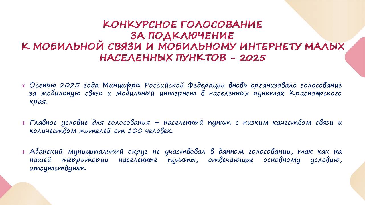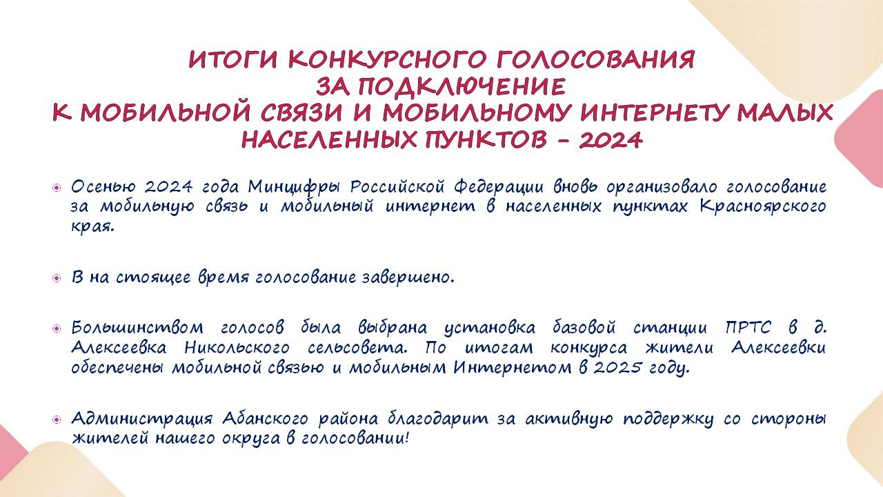 На территории Российской Федерации осенью 2021г впервые было запущено конкурсное голосование за подключение к мобильной связи и мобильному интернету малых населенных пунктов регионов. Администрацией Абанского района совместно с неравнодушными гражданами нашего района было организовано голосование за населенные пункты, где мобильная связь неустойчивая либо полностью отсутствовала.
