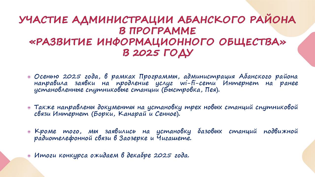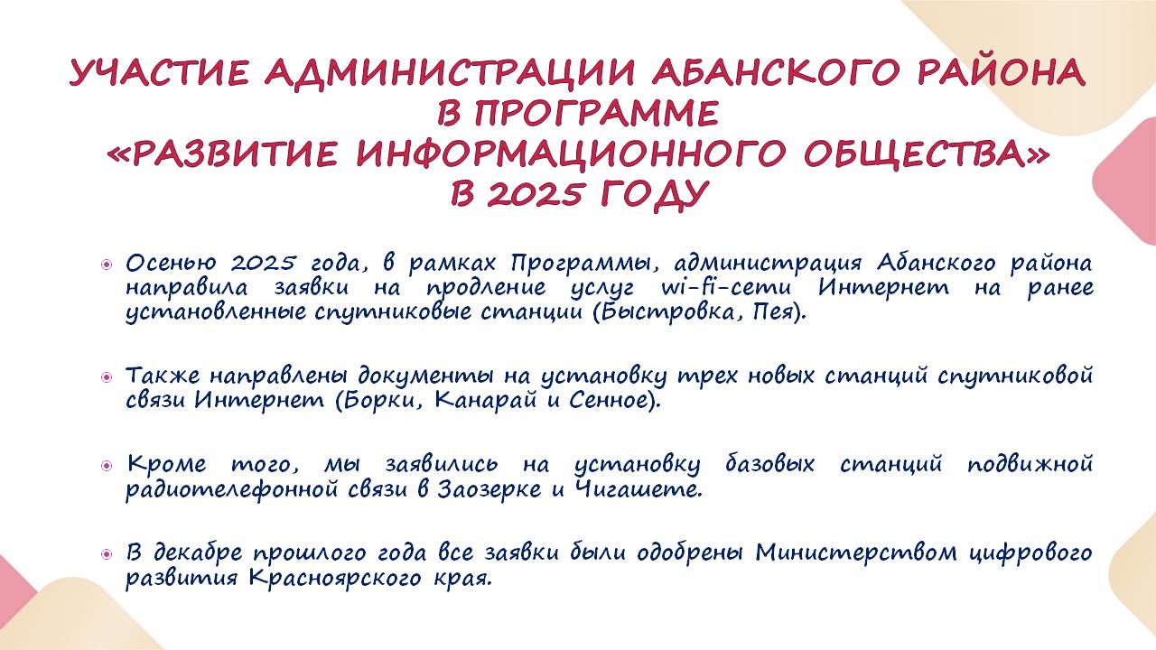 Данный вопрос находится на контроле главы Абанского района, ведется переписка с Министерством цифрового развития Красноярского края, региональными операторами связи, прорабатываются необходимые документы. Мы будем продолжать работу в данном направлении, принимая активное участие в программе.
