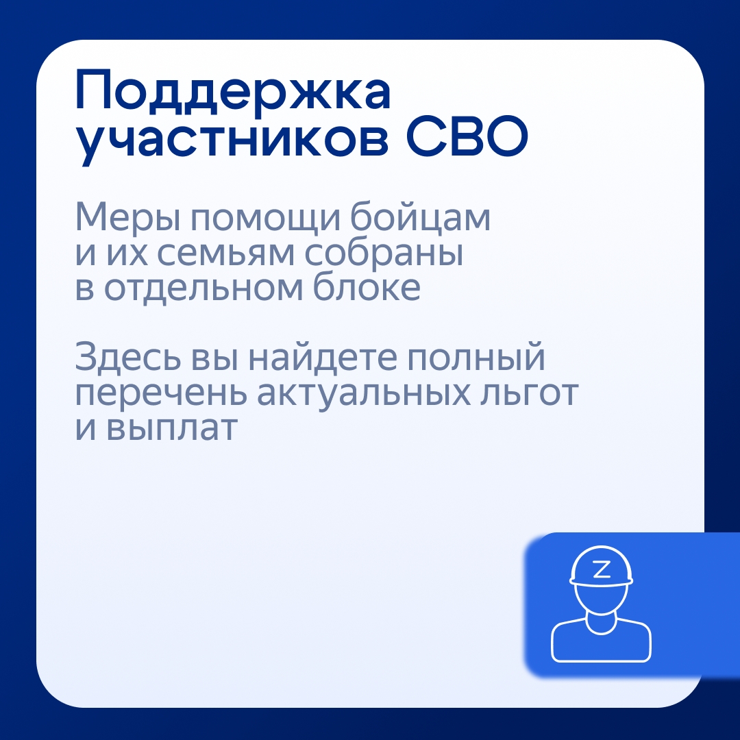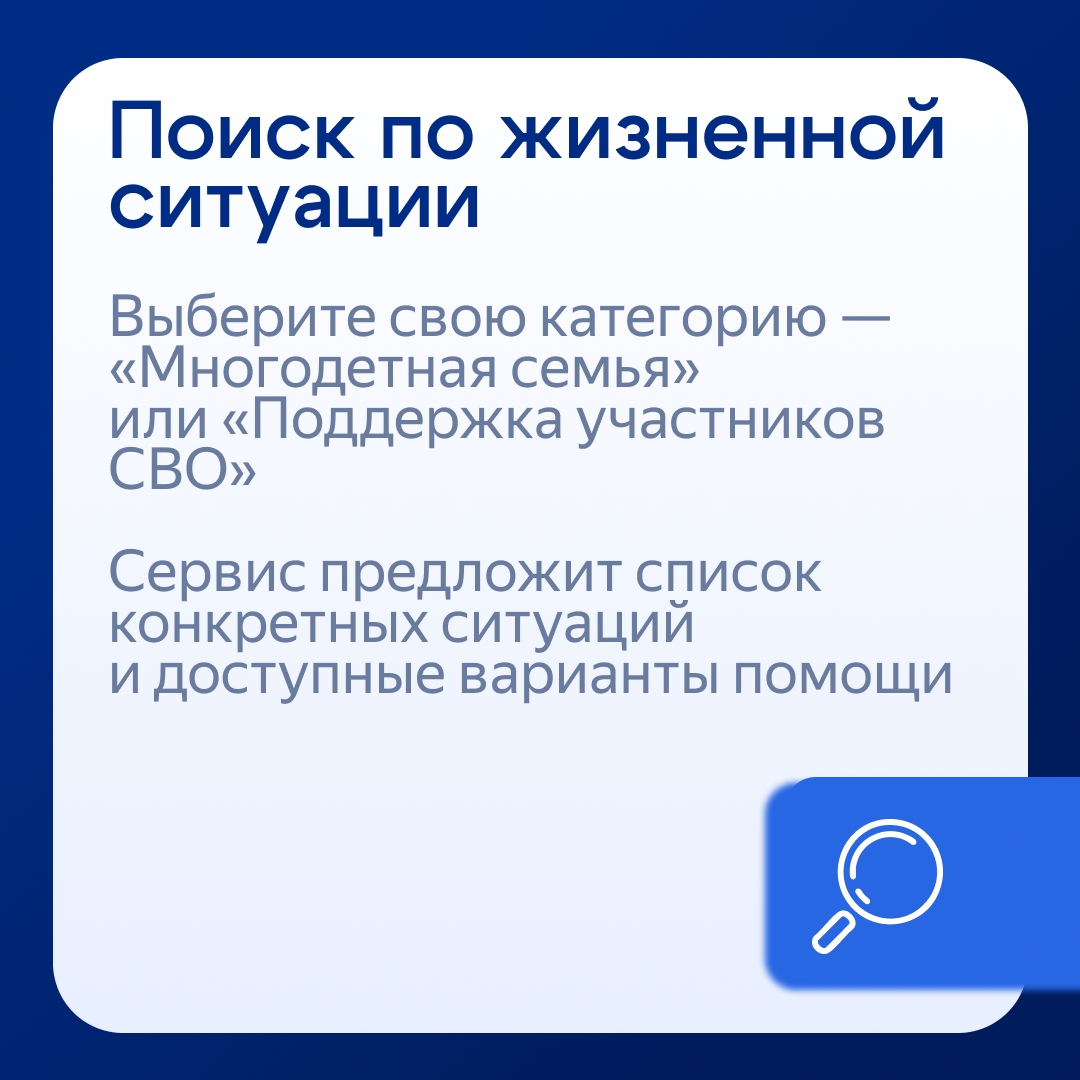 Встроенные в сервис фильтры и критерии, указывающие на индивидуальные особенности гражданина, позволяют быстро найти сведения о социальных льготах, выплатах и услугах. Для удобства поиска информация о мерах поддержки сгруппирована по категориям с жизненными ситуациями. Среди них – отдельные разделы для семей с детьми и для участников СВО и их родственников.